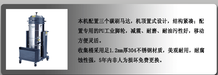 類型:單相工業吸塵器 系列:V3J/V3JS系列 適用工況:適用于空間范圍比較小,要求移動靈活,風量可變的工作區域; 適用于金屬打磨,拋光、激光打標、粉體灌裝等場所的除塵; 適用于食品加工,化工建材、管道清理等場所粉塵吸收;